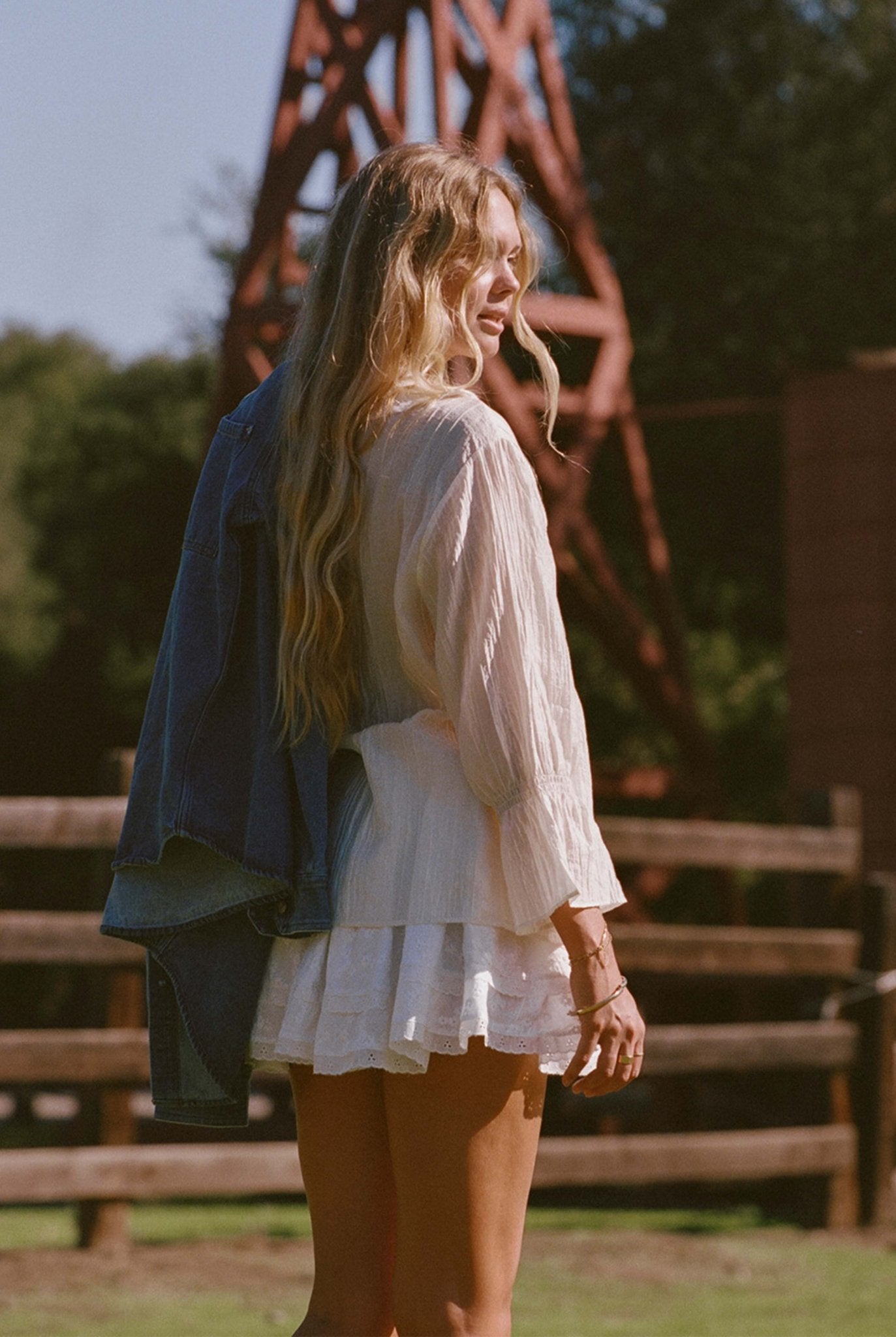 This crème or ivory ruffle top is just whimsical. It has two ties in the front for closure. Can be worn as is, tucked in, or worn over a sweet and short dress. The ruffle top has a neckline and a ruffled sleeve. The top is oversized to give off that effortless chic bohemian look. This is one of our favorite versatile ivory ruffle tops for the Spring Summer season. Chloe boho chic Summer vibes are the best.