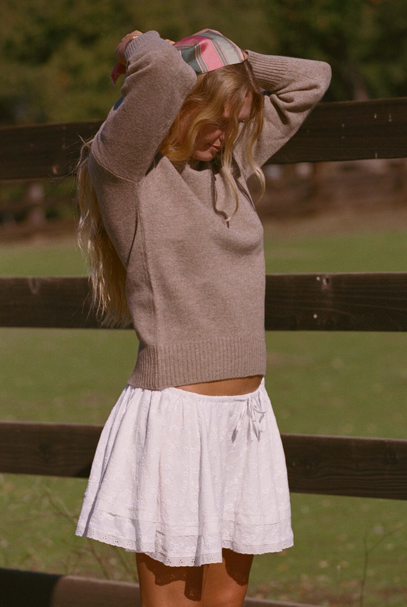 The tan sweater is a sweet comfortable and sophisticated sweater.  It is longer for those that are looking for less of a crop look and is very comfortable.