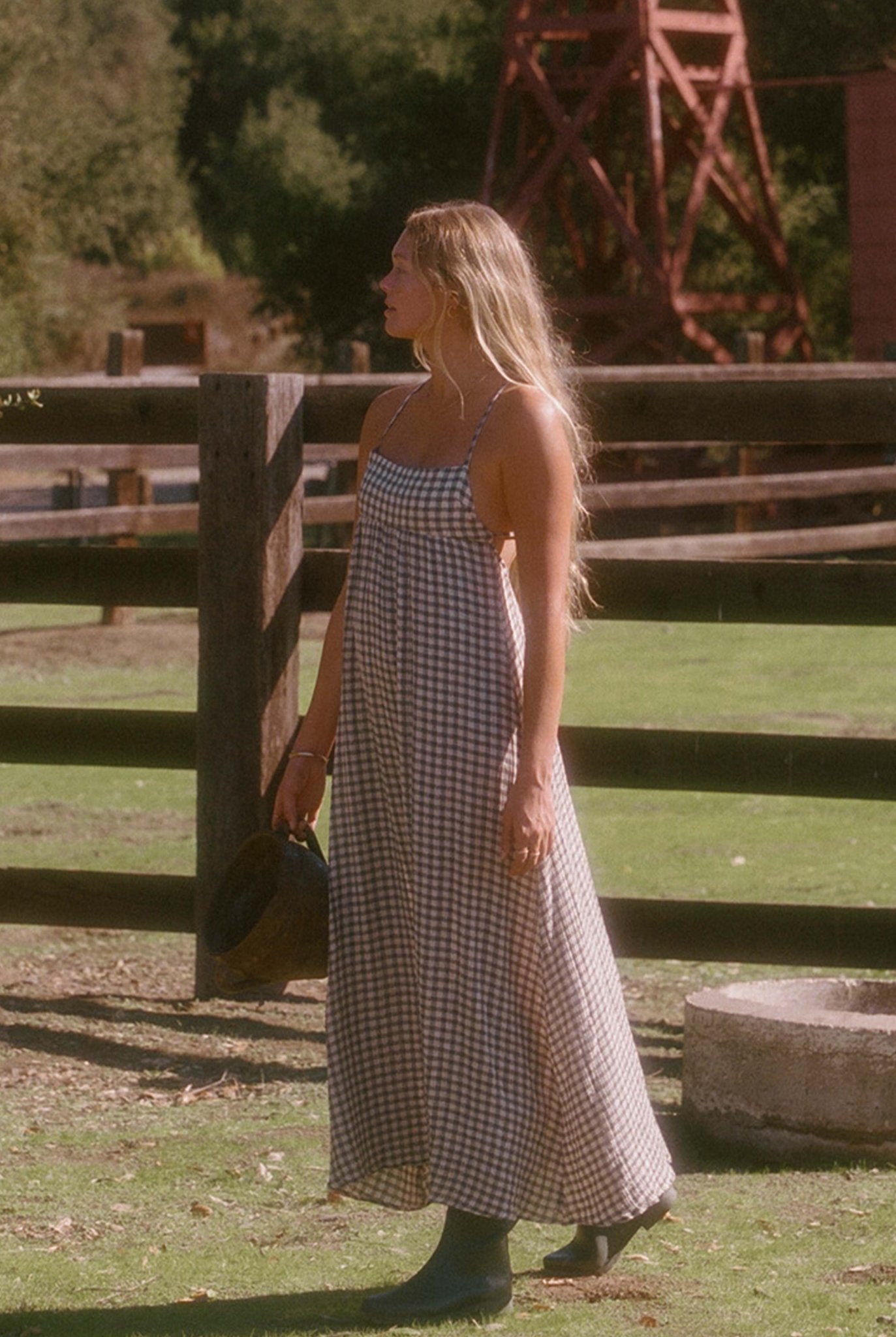 The softest most airy dress in the west. The low back plaid dress is a flowy and airy dress with a low cut strappy back and spaghetti strap front. The low back plaid dress is a black and tan color long dress and is definitely one to feel pretty in. It has a square neckline, low back and a beautiful tie closure. The low back plaid dress has a elastic swoop in the back of the dress that makes it hug the body just perfect.